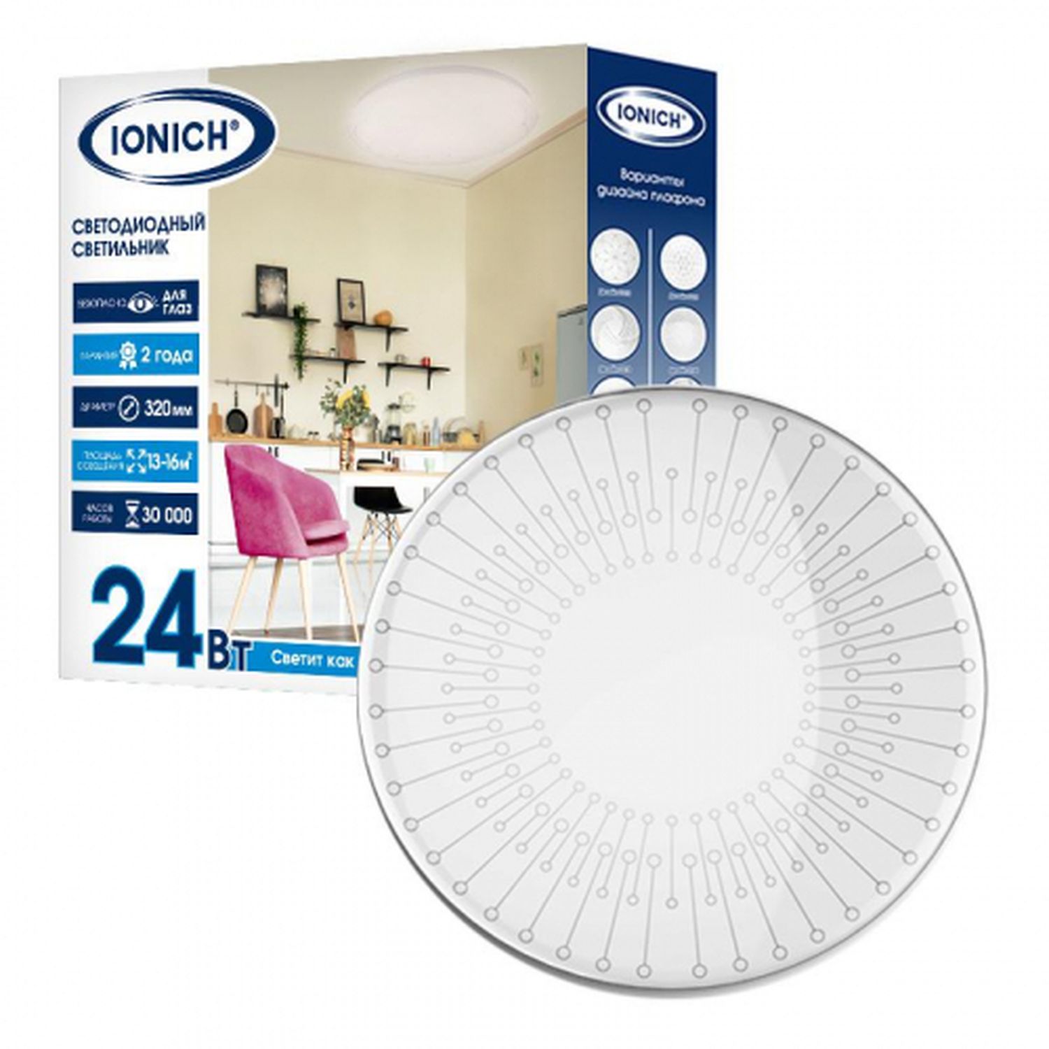 Светильник светодиодный 2160 24Вт 6500К IP20 1680лм d320х60мм бытовой настенно-потолочный IONICH 1705